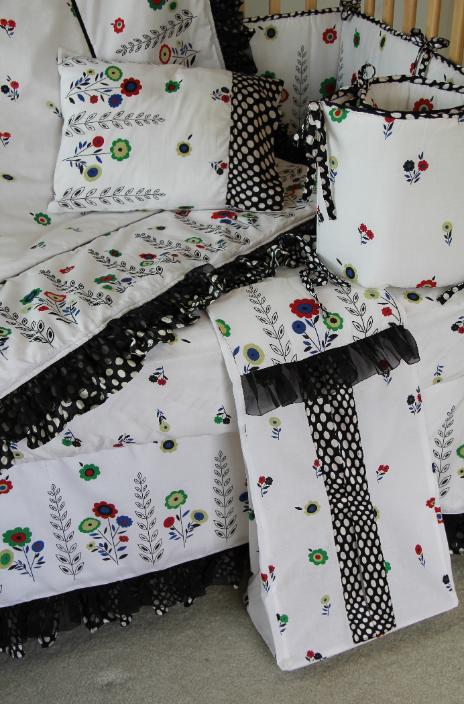 This 7 piece set includes a comforter and matching bumper, fitted sheet, diaper stacker, pillow, pillow-cover and a gorgeous crib skirt.
