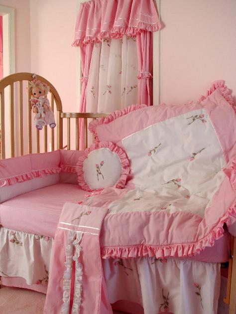 Rose Blush. Extreme elegance and luxury for your baby girl's room. Embroidered pink roses on organdy backed onto pink cotton